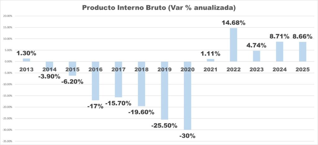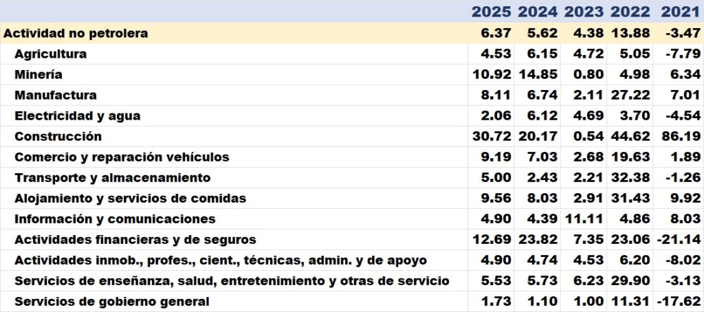 De acordo com o meio de comunicação venezuelano especializado em economia Banca y Negocios, entre 2021 e 2025 destacaram-se alguns sectores, como o da «construção», que apresenta níveis elevados de crescimento sustentado nesse período, com um máximo de 86,19% em 2021 e um mínimo pontual de 0,54% em 2023, o que pode ser descrito como um comportamento muito volátil.
