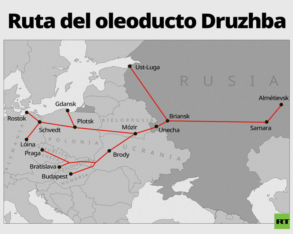 O ramal sul do oleoduto Druzhba, que atravessa a Ucrânia, transporta petróleo russo para a Hungria e a Eslováquia, enquanto o ramal norte, que abastecia a Polónia e a Alemanha, foi encerrado devido às sanções europeias.